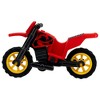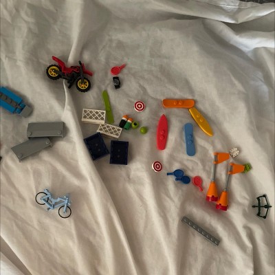 Looking at the picture on the front it’s obvious there’s a motorcycle in the bag, plus a bunch of extra pieces that you can take a guess at what they are to be? THANKS to the reviewer that took pictures of this build completed I was able to copy their build. You get a motorcycle, a bicycle, some parts for a course like a ramp fence etc.. It would be cool if there were some minifigures (people) since there are the bikes & surfboards. Doesn’t come with instructions & I couldn’t find any online so that’s frustrating. Other than that this is a cool little toy & since it’s fairly inexpensive it’s worth buying but I almost feel like this is something I could find at the dollar store.