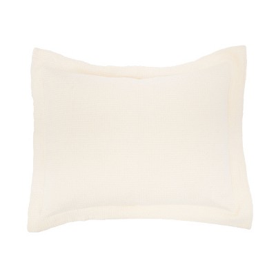 Add an irresistible layer of modern look to your bedroom with this elegant pillow sham. This romantic style coordinates with a variety of colors and matches a wide range of color themes. Bliss brings out the charm of romantic vintage style featuring floral print fabrics, framed with sage and ivory diamond patchwork, bordered with a scalloped edge. Decorative cloth ties on reverse, Overlapping envelope style back,100% Cotton face, back, and fill. Prewashed and preshrunk. Machine washable. Measures: 20" x 36". Color: Ivory.