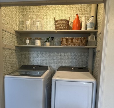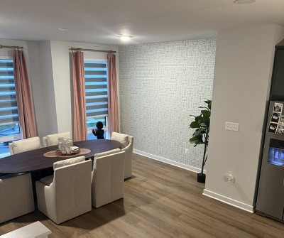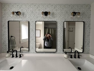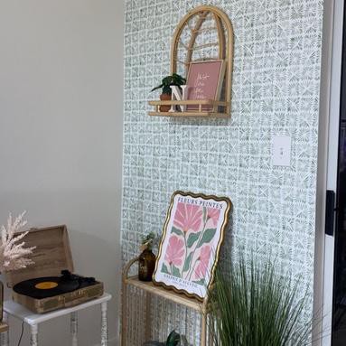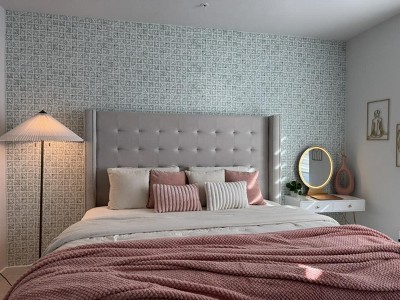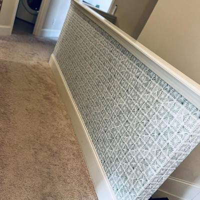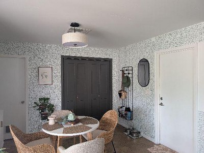 - Printed vinyl wallpaper creates a designer look with minimal effort