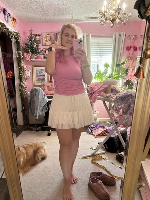 Hard to know what bra to wear with this, the strap will just be showing, oh well. It's so cute the color and the side ruching and bow back make up for it. Super cute with a Popflex pirouette skort.