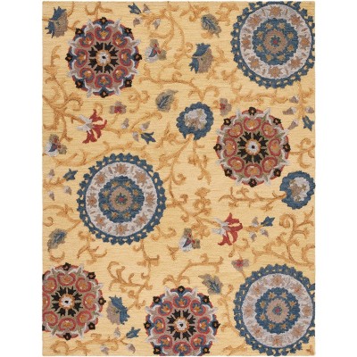 Experience the enchanting allure of our hand-tufted wool area rug, a harmonious blend of tradition and artistry designed to elevate your living space. Measuring a substantial 8' X 10' and boasting a generous 5/8" pile height, this large rectangular rug showcases a rich tapestry of gold hues complemented by a captivating multi-colored pattern that breathes life into any room.