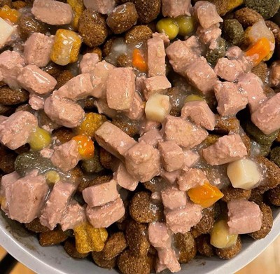 I buy this as a treat to mix in with Belly's dry kibble. Right now she's on our vet's orders to eat wet food for 2 weeks, so we are doing chicken and beef hearty stew. I love that we can see the chunks of meat and veggies in the food. Knock on wood we haven't had a bad can, so we'vealways had plenty of meat and gravy with a good smell. Belly sure enjoys it and at 30lbs a can or two fills her up.