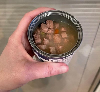I didn't open this can because the side was caved in and I didn't trust the safety of feeding it to my 12 1/2 year old dog. It looked really good, and the next time I'll go into the store to pick a can without a large dent. I really like Blue Buffalo and rarely feed canned food, so this was supposed to be a special treat.