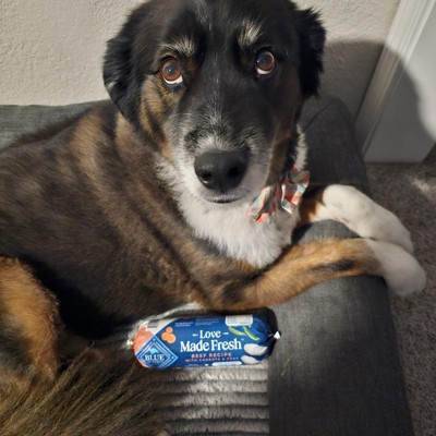 [This review was collected as part of a promotion.] Our dog devoured his meal when we topped it with the Blue Buffalo Love made Fresh adult dog beef recipe with carrots and peas! It was gone so fast!