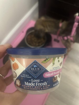 [This review was collected as part of a promotion.] Our little furbaby got the chance to try Blue Buffalo Love Made Fresh Small Breed Chunky Beef Stew with Carrots and Peas. The tub was easy to open and resealable. The beef stew had a nice texture and our dog enjoyed the taste. She licked her bowl after each feeding and wanted more. There wasn't any trouble digesting the food and we're glad she enjoyed it.