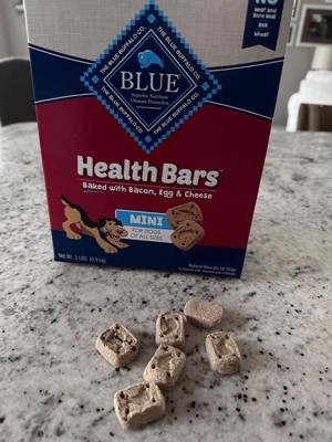 - Contains: One (1) 2-lb box of BLUE Mini Health Bars Natural Crunchy Dog Treats Biscuits, Apples & Yogurt