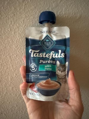 - Contains one Three oz Resealable Twist Cap Pouch of BLUE Tastefuls Adult Cat Natural Purées