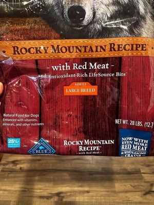 PACKED WITH REAL RED MEAT: Made to satisfy your dog’s innate cravings, this protein-rich food starts with real, high-quality deboned red meat. INCLUDES WHOLESOME GRAINS: Complex carbohydrates from wholesome grains — including oatmeal, barley, and brown rice — ensure a truly balanced diet that meets your large breed dog’s unique energy needs ANTIOXIDANT-RICH LIFESOURCE BITS: Enhancing our nutrient-dense dry food are LifeSource Bits, a precise blend of antioxidants, vitamins, and minerals to support immune system health, life stage needs, and a healthy oxidative balance NATURAL INGREDIENTS: Blue Buffalo dry dog food is made with the finest natural ingredients enhanced with vitamins, minerals, and other nutrients. It contains NO chicken (or poultry) by-product meals, NO corn, wheat, or soy, and NO artificial flavors or preservatives Contains one (1) 24 lb bag of BLUE Wilderness Rocky Mountain Recipe High Protein Natural Large Breed Adult Dry Dog Food, Red Meat