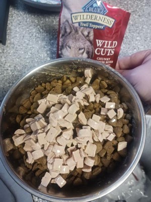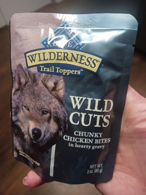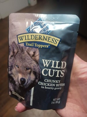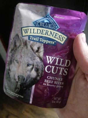I have a red nose pitbull part shar pei rescue dog. She absolutely loves this Blue Buffalo wilderness Wild Cuts toppers. These add a delicious incentive to eat her dry kibble. She can not resist the tempting aroma that fills the air every time I open a pouch. They are decently affordable. I do love the packaging it has a rugged vibe. The natural ingredients are healthier than a lot of the other choices for dog food toppers. These come in multiple flavors. My dog really loves the variety in the multiple flavors. When your dog wants choices and not the same thing every day, I suggest mixing it up with the same brand that you can trust. I highly recommend these, and I will definitely repurchase them. They did not cause any kind of irritation or sensitivity to her digestive system.