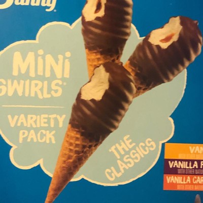 Blue Bunny mini swirls are really mini! They are tasty but small. The variety pack has Vanilla Caramel, Vanilla and Vanilla Fudge. I think these are perfect for the little ones so they don't get overloaded on sweets. I myself eat 2 at a time. That's ok because I can change flavors.