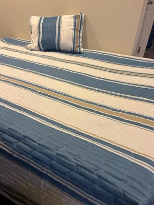 [This review was collected as part of a promotion.] I was gifted this product in exchange for my honest opinion and I actually love this set. It's a lovely reversible pattern in a nuetral color scheme. As shown in my photo, the quilt features a calming under the sea scape on one side and stripes on the other. It is very high quality, even after washing several times. It's light for the warm weather and I can fit in my regular washing machine! I love it and have received compliments on it.