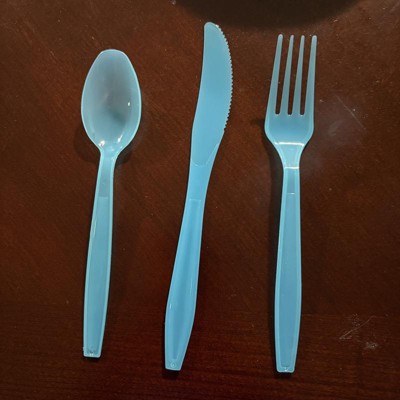[This review was collected as part of a promotion.] These are a pretty blue color and reminds me of summer. These are a good quality disposable flatware set and have 8 of each silverware type. They held up well for a dinner party of adults.. I opted for disposable flatware for dinner for an easy clean up and these met expectations. I highly recommend these for the quality and feel the price is fair for the quality and quantity. I received an incentive to write this review.