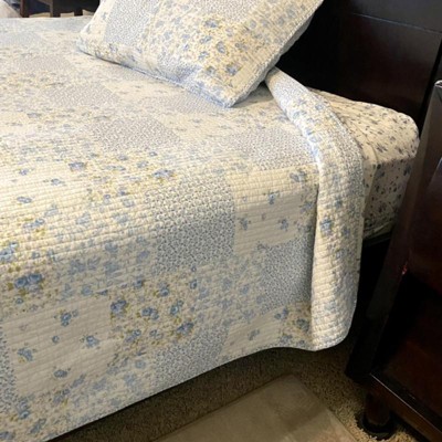 The Kenna quilt set combines a medley of small-scale vintage prints in a classic patchwork to create a charming cottage look. The fresh airy palette of blue and white along with narrow horizontal channel quilting adds a modern edge. The quilt reverses to one of the coordinate prints that also trims the edges of the quilt and shams. Prewashed for softness, this 100% cotton quilt set becomes cozier with each wash. Filled with a blend of 80% cotton/20% poly it is light weight yet can be layered for year-round use. set includes one quilt and two shams for full/queen and king size, one sham for twin size. Machine washable for easy care.