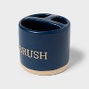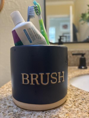 Neatly and effortlessly store your kids' toothbrushes in this Kids' Toothbrush Holder from Pillowfort™. Made of ceramic, this toothbrush holder features raised "Brush" text and a contrasting base in a beige hue for an eye-catching look. The holder is divided into three sections — a large one to hold toothpaste and two small sections for toothbrushes. Designed in a round shape, this blue toothbrush holder makes a great addition to their bathroom.