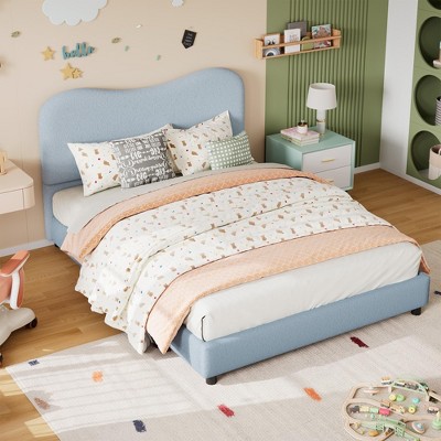 Blue Queen Kids Bed Frame, Upholstered Headboard, Soft Boucle Fabric for Girls and Boys, Noise Free, No Box Spring Needed