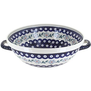 Elevate everyday kitchen tasks with this beautifully handcrafted colander, designed to be both functional and decorative. Measuring 9.5 inches in diameter and 11 inches from handle to handle, it offers plenty of space for rinsing fresh berries, leafy greens, pasta, or garden vegetables. The sturdy handles make it easy to carry from sink to table, turning a simple strainer into a serving piece that doubles as a conversation starter. Each colander is handmade and hand-painted in Poland, with bold patterns and vibrant colors that reflect generations of artisan tradition. High-fired stoneware construction ensures lasting durability, while the double-glazed finish makes it chip-resistant, easy to clean, and resistant to stains. Safe for use in the dishwasher, microwave, oven, and freezer, it delivers modern convenience along with timeless craftsmanship. The decorative design means you can serve straight from the colander—fresh strawberries at breakfast, grapes or cherries for a snack, or pasta at dinner—adding elegance to every meal. More than a kitchen essential, this colander is a versatile heirloom-quality piece that combines utility with artistry, making it an ideal addition to your collection or a thoughtful gift for anyone who loves to cook and entertain.
