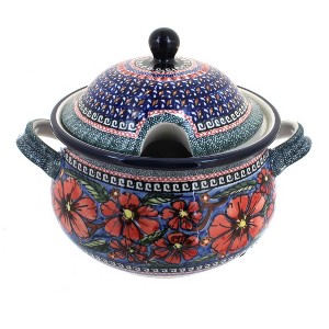 This beautiful soup tureen is a true centerpiece for your table, combining functionality with timeless artistry. With a generous 12.5-cup capacity, it’s large enough to serve family-sized portions of soups, stews, or chili, making it perfect for both everyday meals and special gatherings. Measuring 11 inches in diameter and 8 inches high, it has a substantial presence that makes it as decorative as it is practical. Each tureen is handmade and hand-painted in Poland, featuring vibrant patterns and detailed artistry that highlight centuries of tradition, so no two are exactly alike. Crafted from high-fired stoneware, it’s chip-resistant, durable, and built for long-lasting use. Double-glazed for added strength and easy cleaning, this tureen is also safe for the oven, microwave, dishwasher, and freezer, offering modern convenience with heirloom-quality craftsmanship. Please note: this piece is not intended for stovetop use. Whether paired with a matching ladle and platter or enjoyed on its own, this soup tureen is a functional work of art that will add beauty and elegance to every meal.