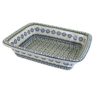 Enjoy both function and artistry with this rectangular baker, a versatile dish designed to make everyday cooking and serving effortless. Measuring 11.25" long x 9.25" wide x 2.75" high; 2.38" deep. Its compact dimensions make it easy to use for daily baking, while its elegant design ensures it transitions beautifully from oven to table. Each baker is handmade and hand-painted in Poland, decorated with vibrant patterns that make every piece truly one of a kind. Crafted from durable, high-fired stoneware, it is celebrated for its even baking, excellent heat retention, and easy cleanup, offering reliable performance with heirloom-quality charm. Safe for the oven, microwave, dishwasher, and freezer, this baker blends traditional craftsmanship with modern convenience. Whether preparing a quick dessert for family, a side dish for guests, or a special recipe to share, this baker brings color, durability, and authentic artistry to your kitchen.