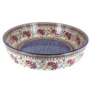 Serve up something special with this large round baking dish, a versatile piece designed for both sweet and savory favorites. Measuring 12.25" in diameter and 2.5" deep. The round shape provides even heat distribution and an elegant presentation, making it as functional as it is beautiful. Each dish is handmade and hand-painted in Poland, showcasing vibrant, detailed patterns that transform everyday bakeware into a true work of art. Crafted from durable, high-fired stoneware, itÂ’s built to last and is known for its even baking, excellent heat retention, and resistance to chips and scratches. Safe for the oven, microwave, dishwasher, and freezer, it offers modern convenience while preserving the beauty of traditional craftsmanship. Perfect for holiday entertaining, family dinners, or casual gatherings, this large round baking dish blends heirloom quality with everyday practicality, making it a timeless addition to any kitchen.