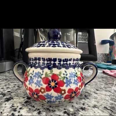 This refined ceramic cream and sugar set with tray is the perfect companion for your daily coffee or tea, combining practical function with timeless handcrafted beauty. The set includes a sugar bowl with a 6-ounce capacity and 3.75-inch height, paired with a matching creamer that holds 6 ounces and stands 3 inches tall. Both pieces rest neatly on an 8.5 by 5-inch tray, keeping your table organized and adding a polished look to your countertop or serving space. Handcrafted from durable, high-fired ceramic, each piece is hand painted in traditional Polish pottery patterns, making every set unique with vibrant colors and intricate detail. The smooth glaze highlights the artistry of the designs while also providing durability and easy maintenance. Safe for both the microwave and dishwasher, the set is built for daily use while maintaining its decorative charm. Perfect to keep out on display, to serve guests, or to give as a thoughtful gift, this cream and sugar set with tray blends functionality with the timeless artistry of Polish pottery.
