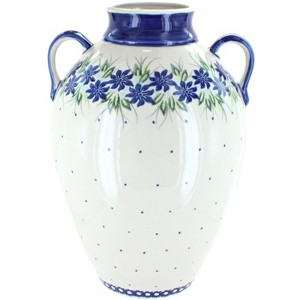 10.5" tall x 7" wide at the widest part - opening for flowers - 2.5". The Art of Polish Pottery, as we know it today, started as local folk art centuries ago in the German province of Silesia. The first known pieces of “Bunzlauer” stoneware dating back to the 16th century were crafted by hand and decorated with a folk art stamping technique using potatoes. Original designs were inspired by the peacock feather using the colors of cobalt blue, sage green and ferrous red. These designs and colors are still the inspiration for modern day patterns.Today, skilled Polish artists still individually handcraft and hand decorate each piece using small sponges to stamp each pattern and color. After the process of mixing ingredients, molding the pottery, applying the decorations and glaze, the pottery is twice fired. This process makes the pottery extremely durable, it will not crack or chip easily, and it is perfect for use in the microwave, dishwasher, oven and freezer. Along with our pottery, we have sourced a range of absolutely beautiful hand blown glassware from Poland. It is the perfect addition to your Polish Pottery Collection!