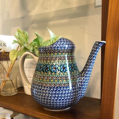 Crafted from durable materials, this watering can is both functional and decorative, making it a must-have for anyone with a green thumb. Standing 8 inches tall, it is perfectly sized for watering indoor plants, outdoor planters, or window boxes. The thoughtfully designed easy-pour spout allows for controlled, gentle watering, helping to keep your flowers and greenery healthy without over-soaking the soil. Handcrafted from high-fired ceramic and hand painted in traditional Polish pottery patterns, each watering can is a unique piece of art, with vibrant colors and intricate designs that bring charm to your gardening routine. The smooth glazed finish enhances the artistry while providing durability, resisting stains, and making the can simple to clean. While practical for daily use, it also doubles as a decorative accent—place it near a planter, in a sunroom, or on a windowsill to add a pop of color and handcrafted beauty to your space. Functional yet stylish, this watering can is a thoughtful gift for gardeners, pottery lovers, or anyone who enjoys blending utility with artistry in their home and garden.