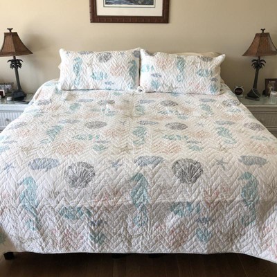 - THE BLUE SEA DESIGN: One of our most popular quilt sets, Blue Sea is inspired by a sun-kissed vacation on a sandy island, with a seahorses, shell and coral in shades of coral, grey, teal and blue on a white ground and a charming reverse pattern of grey and white chevron. A bound border provides contrast and texture to complete the look. The matching shams are randomly cut from the same fabric as the quilt, making each sham unique and not identical to any other sham.
