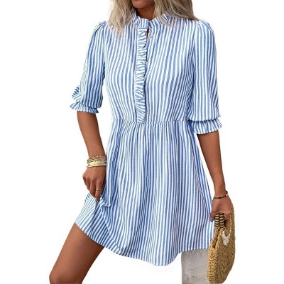 Refresh your casual wardrobe with this charming striped shirt dress featuring flattering vertical lines that create a fresh, put-together look. The delicate ruffle collar adds a feminine touch, while short puff sleeves bring playful style to your warm-weather outfits. Designed for comfort and versatility, this dress works perfectly for brunch dates, office settings, or weekend strolls.
