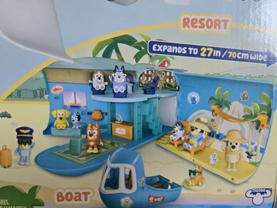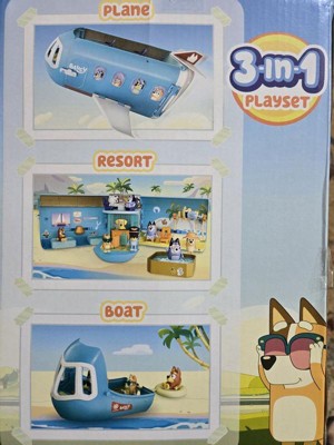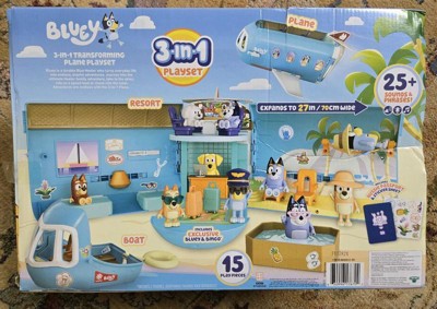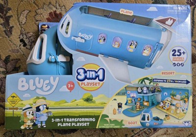- The Bluey 3-in-1 Transforming Plane Playset! Transforms easily transforms from a plane into a resort and a boat.