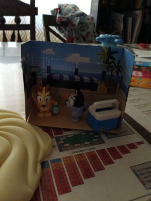 [This review was collected as part of a promotion.] This play set comes with a cardboard background of the beach. It also has two figurines. One is socks and the other is bingo. They are holding popsicles. They also come with a cooler. It is a fun set of figurines that bend at the waist.