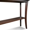 The Boa Console Hall Stand by Leick Home brings a touch of glamour and practicality to entryways, hallways, foyers, and living rooms. Whether used to hold keys and mail in an entryway, as a stylish accent behind a sofa, or as a functional addition in a hallway, this console table offers versatile use for any space. The gracefully curved sabre leg design and rich chocolate cherry brown finish provide a timeless aesthetic that enhances both traditional and modern decor styles. Designed with a space-saving silhouette, it fits perfectly against walls, making it ideal for apartments, condos, and smaller homes where maximizing floor space is essential. Crafted from solid wood, this sturdy table is built for everyday use, offering long-lasting durability. The cut-corner tabletop design eliminates sharp edges, making it safer for high-traffic areas and homes with children or pets. A lower display shelf provides ample space for books, baskets, plants, or decorative items, helping to keep your space organized and stylish. Measuring 38 inches wide, 14 inches deep, and 30 inches high, the Boa console table offers the perfect balance of storage and style without overwhelming your space. Designed for easy assembly, it includes clear instructions and all necessary tools for a quick, hassle-free setup. With a weight capacity of 100 lbs., this table can easily support lamps, framed photos, and other essentials. Trust Leick Home’s 150+ years of craftsmanship to bring quality and timeless design to your home, backed by a 1-year limited warranty.