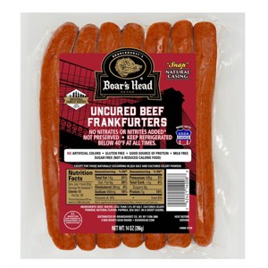 Crafted from an original family recipe, Boar's Head® Uncured Beef Frankfurters are made with USDA Choice Beef and select seasonings for an exceptional flavor and a bite with a "snap". Boar’s Head foods are made to standards rarely found today. When you want the best, ours is the name you can trust.