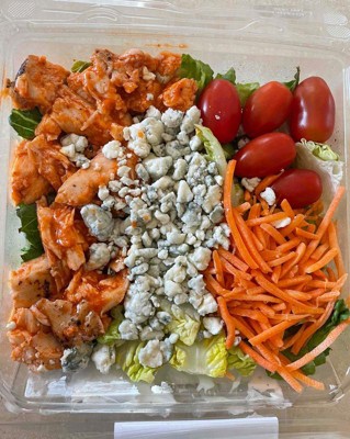 romaine lettuce, buffalo chicken (boars head blazing buffalo style oven roasted chicken breast boneless skinless [coated with: cayenne red pepper, vinegar, salt, spice, paprika, rice starch, garlic, natural flavor, sugar. ingredients: chicken breast, water, contains 1.5% or less of salt, sugar, sodium phosphate and dextrose. browned in sunflower oil], buffalo sauce [cayenne pepper sauce {aged cayenne red pepper, distilled vinegar, water, salt, garlic powder}, butter {pasteurized cream, salt}], xanthan gum]), grape tomatoes, boars head creamy blue cheese (whole milk, salt, cheese cultures, enzymes, penicillium roqueforti, potato starch), ranch dressing (vegetable oil [canola and or soybean oil], non fat buttermilk [whey, water, skim milk powder, corn starch, tapioca starch, carrageenan, locust bean gum, cultures], water, egg yolk, non fat sour cream [cultured skim milk, corn starch, tapioca starch, carrageenan, locust bean gum], less than 2% of dried garlic, distilled vinegar, salt, seasoning blend [dextrose, salt, natural flavors, modified corn starch], sugar, dried onion, spices, modified corn starch, dried green onion, lactic acid, xanthan gum, guar gum), carrots.