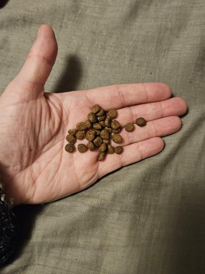 My cats like this dry cat food. The seafood cat food is a bit strong potent. I tried the food in my cats wet food and they didn't take to that but mixing in the dry food, my cats were happy with that. The pellets are small and I gave about a handful to my cats. I have two cats. I noticed they seemed more active. Overall I am happy with this product, the smell is just a bit strong though.