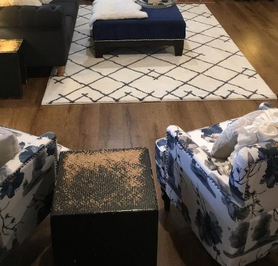 Q: Is the fabric white or cream? Wondering if I can pattern mix with the Harrison Tufted Blue Checker.