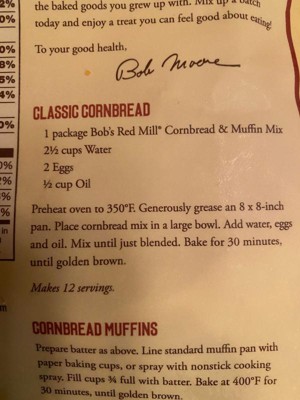 I love all Bob's Red Mill products. This corn bread is low in sugar and high in taste and texture. I would like to suggest a change in the directions. Please add directions for an 8 inch baking pan also. Most people and I don't have a 9 inch pan and people like me that don't make it often, forget to add 5 minutes to the baking time.