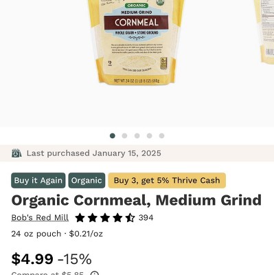 Organic Medium Grind Cornmeal from Bob's Red Mill is a great natural source of whole grain. It's stone ground for great texture. The secret to Bob's Red Mill Cornmeal is leaving the corn germ in. It gives the cornmeal more nutrition and taste. Because corn germ is at such a premium for unsaturated cooking oils and margarines, most other makers of corn products remove it. Try today!!