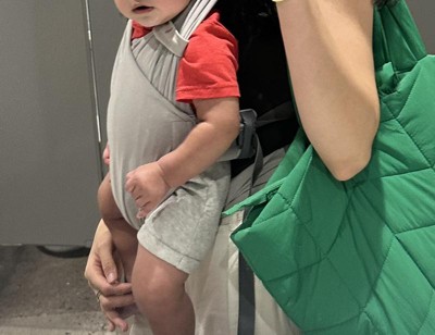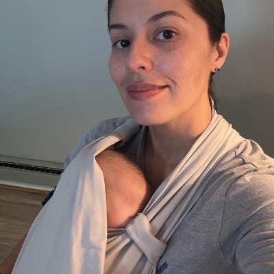 • STEP 2: Position baby on your front and bring the panel of the carrier over their back