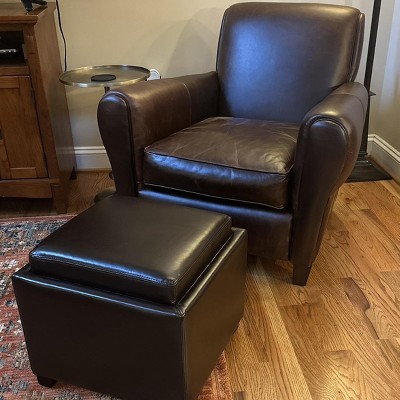 Much nicer than in pictures. I needed a leather ottoman, but I didn’t have enough space for a full sized one without it being in the way. I saw this and thought it looked nice. The brand has a pretty good reputation for value priced home goods. I was really surprised when it arrived. It was extremely well packed. It looks great w my leather market chair. I was worried bc the market chair is an expensive leather chair; so I was worried they wouldn’t pair well. But they are a perfect match. Very happy.