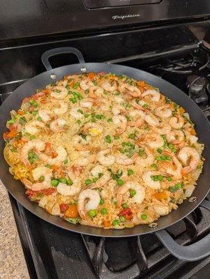 [This review was collected as part of a promotion.] I was sent this paella pan to review and was excited to finally be motivated to make paella. I made sure to buy the recommended rice for the dish and followed a recipe with several reviews online. This paella dish is quite large compared to standard skillets, so I did notice the outside edge around the lip didn't get as hot (not sure it matters but we have a flame top range). However, everything cooked through well and my only problem was I added too much liquid to the recipe. I don't have a lot of experience with paella pans but didn't seem to have any major issues with this one!
