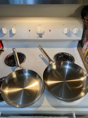[This review was collected as part of a promotion.] Absolutely loving these Bobby Flay stainless steel pans! The sizes are great for small and large cooking. I’ve used these all week for everything from quick stirfrys, to steaks pan grilled and pan broiled in the oven! They work GREAT. As with all stainless steel steel pans, it’s all in the heating of the pan before adding fat/ingredients. And these work great for heat distribution and I haven’t experienced any issues. We are I. The process of replacing our cookware with stainless steel and these are the perfect addition into our kitchen. Great weight in the hand for sautéing with ease and heavy enough to feel great in the hand. Loving the added versatility of cooktop to oven cooking. Cleaning is simple and stubborn stains lift easily with barkeepers friend if needed. Overall loving the pans and the brand and will be investing in more.