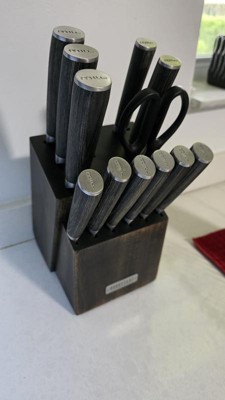 Love the weight of the knives and the texture/fit of the handles. Wish the storage block was angled more forward because it doesn’t fit under the cabinets. I moved them to drawer storage instead. Beautiful set and would be a lovely gift for a host, new home owner, or couple starting out.