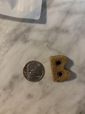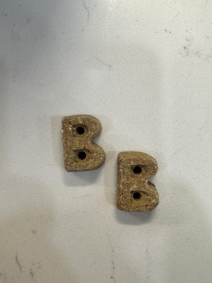 These birthday cake treats are cute. They have decent ingredients and smell pretty good! My dog is about 27 lbs and seems to enjoy these treats. She did prefer when I broke them in half doe her, although they aren’t super hard. The little”B” shape is cute!