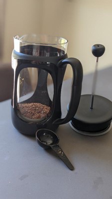 The coffee press is well-made compared to some other presses I’ve had. The wrap around the glass seems durable and holds the glass well. It’s quite light-weight. The top does have a separate pour area. I like this so that I can turn it so not as much steam escapes. When I pressed the handle, it was a very gentle glide. After I poured my coffee there were virtually no grounds. It also comes with a scoop for measuring coffee. The only additional feature which would have been nice is an approximation marker for cups. I didn’t want to make 8 cups and needed to eyeball the measurement.