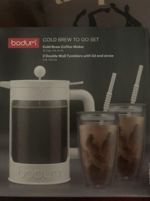 - Contains one 51 oz coffee brewer with two lids, two 13.5 oz Pavina-To-Go Tumblers with two lids and two straws.