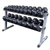 Now in Black! Get stronger and keep your home workout area organized with the Body Solid GDR60-RFWS Dumbbell Rack and Set. It is equipped with the essentials and features one pair each of 5-50 lb. hex rubber dumbbells. Space-saving dumbbell rack stores dumbbells safely. Durable, rubber mat helps protect your floors. Built with quality construction. Rack has two shelves. Built with heavy gauge steel. Four-side welded for superior durability. Deburred inside and out for user safety. Patent-pending Secure Dumbbell System combines one-piece cast iron heads with steel inserts that have been pinned, press-fitted, and welded.