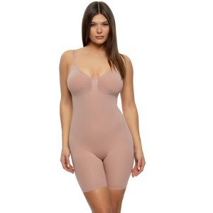 A short style bodysuit that looks delicate, feminine & feels soft yet has strong compression to sculpt your body to perfection. It feels sexy as a bodysuit top worn with jeans or worn under garments to enhance your shape. With two neutral colors you can easily coordinate with many types of outfits. The shorts eliminate underwear lines and help smooth the hips and thighs. While the compression around your waist & core cinches your waist in creating a nicely sculpted bust up top. Wearing this body suit makes you feel feminine, sexy, strong & confident either under your clothes or as your outerwear apparel. * Sculpting allover compression * Strong targeted compression along the core, waist & stomach *Short to eliminate panty lines. *Specific zoning to create support around the bust area. * Mid Thigh short coverage shapes the hips and thighs *Back pockets for gravity defying booty lift * Pull on style with adjustable straps for your comfort. * Open gusset for ease of wear Wash before wearing. Hand wash cold separately. Do not bleach. Do not twist or wring. Reshape. Lay flat to dry. Do not iron. Do not dry clean.