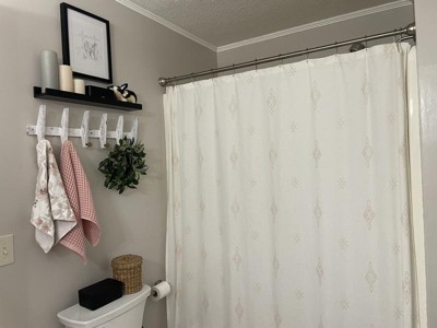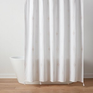 Fill your bath routine with elegant style with this Printed Shower Curtain from Threshold™. This decorative shower curtain features diamond-shaped print in muted hues on a cream background for classic style, while tassels at the trim lend extra flair. Made from 100% cotton, this printed shower curtain features a buttonhole top for quick installation, while the machine-washable design allows for easy cleaning when needed.