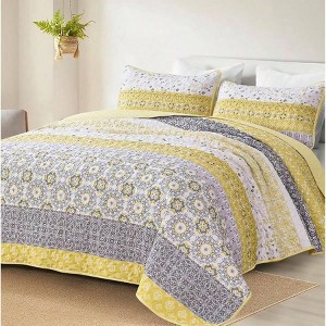 Boho Quilt Set Queen, Yellow Bohemian Striped Patchwork Bedspread with 2 Pillowcases