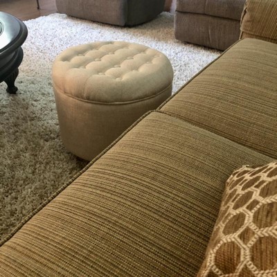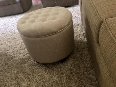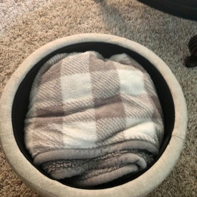 I love this piece. I ordered 3. They are a beautiful neutral. They are the perfect height for my sofa to act as footrest as well as the perfect height to provide extra seating at the game table. I love the styling including the buttons and feet. The cherry on top is the bonus storage as they comfortably store a thick blanket. Mine are Not the thin blankets but a oversized thick cozy blanket you want in the winter with a cup of hot chocolate. The fact that I can store one in each is extraordinary! I caught on sale and feel it is a fair value. Highly recommend.